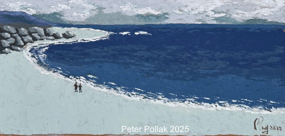 | “Bahía, mar, día nublado” es una pintura al óleo realizada con técnica de espátula que evoca una atmósfera silenciosa y contemplativa. La escena se organiza en grandes planos horizontales donde el mar, de azules profundos y grises matizados, ocupa el centro de la composición, trabajado con empastes densos que sugieren el movimiento pausado del agua bajo un cielo cubierto. La bahía se cierra suavemente hacia la izquierda con un borde de rocas claras y un promontorio lejano, construidos con trazos firmes y texturas marcadas que contrastan con la superficie más uniforme del mar. La línea de espuma, aplicada con gestos breves y decididos, define el encuentro entre el agua y la arena, aportando ritmo y continuidad visual. En primer plano, la playa de tonos claros y fríos se extiende de manera amplia y silenciosa. Dos pequeñas figuras humanas, apenas insinuadas, caminan junto a la orilla; su presencia introduce escala y un sutil relato de intimidad frente a la inmensidad del paisaje. El cielo, cubierto de nubes espesas resueltas con capas superpuestas de grises y blancos, envuelve la escena en una luz difusa que suaviza los contrastes y refuerza el carácter introspectivo de la obra. En conjunto, la pintura propone una mirada serena y reflexiva del litoral, donde la materia, el color y la atmósfera se funden para transmitir la calma melancólica de un día nublado frente al mar. |