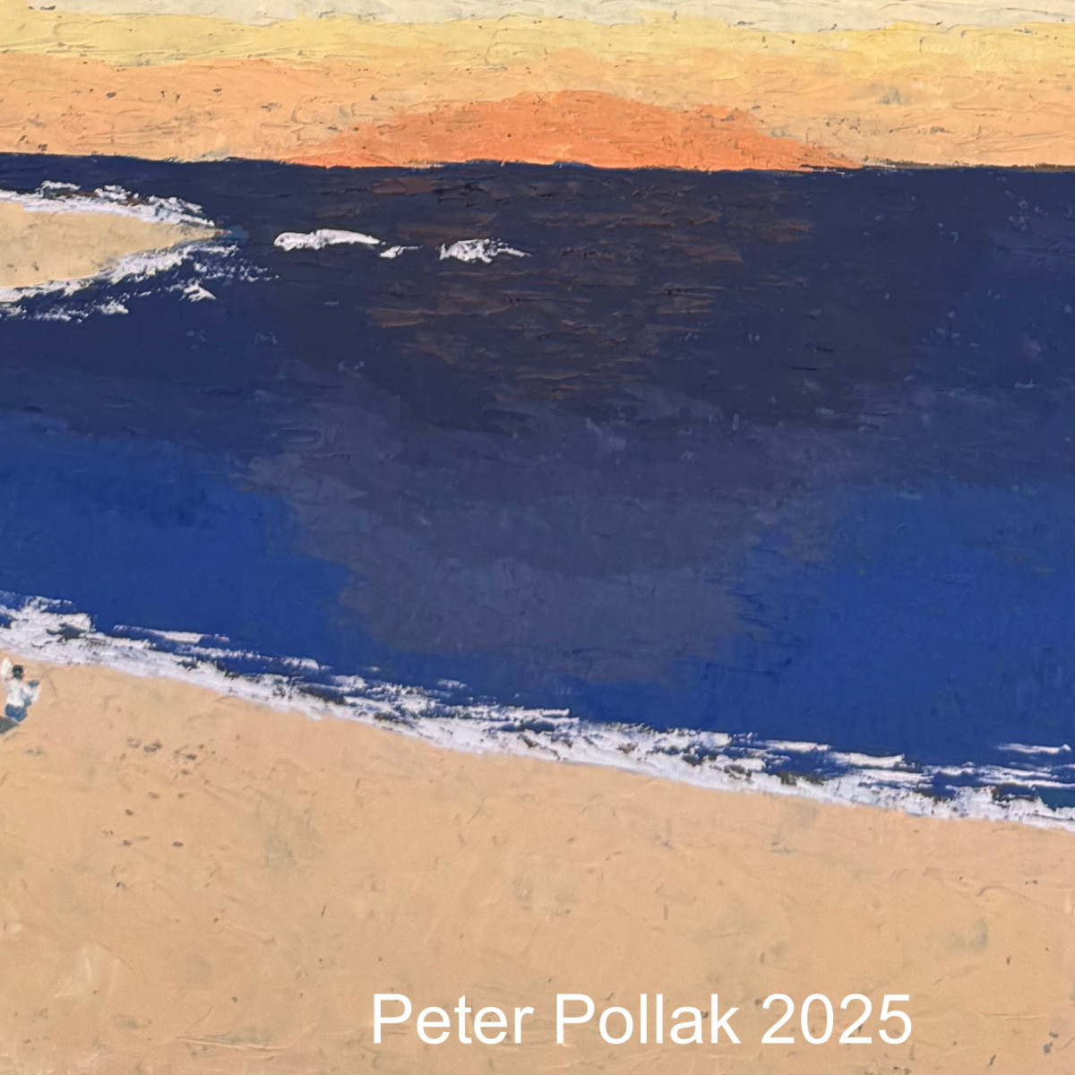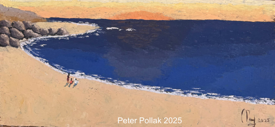 | “Bahía, mar, puesta de sol” es una pintura al óleo de Pollak realizada con técnica de espátula que captura la transición silenciosa entre el día y la noche en un paisaje costero. La composición se estructura en amplios planos horizontales donde el mar, de azules profundos y densos, refleja la luz decreciente del atardecer, trabajado con empastes firmes que transmiten peso y profundidad. En el horizonte, el cielo se tiñe de tonos cálidos —ocres, amarillos y naranjas suaves— que se funden gradualmente, sugiriendo el resplandor final del sol ocultándose tras la línea lejana. Este contraste entre los colores cálidos del cielo y los fríos del mar genera una tensión armónica que define el carácter de la obra. La bahía se cierra hacia la izquierda con un conjunto de rocas y una franja de arena clara, resueltas con trazos decididos y texturas marcadas. La línea de espuma, aplicada con gestos breves de blanco, delimita el encuentro entre el agua y la playa, aportando ritmo y continuidad visual. En primer plano, pequeñas figuras humanas caminan junto a la orilla. Apenas sugeridas, introducen escala y humanidad en la escena, reforzando la sensación de contemplación y recogimiento frente a la vastedad del paisaje. En conjunto, la obra transmite una atmósfera serena y reflexiva, donde la materia pictórica y la luz del atardecer se conjugan para evocar la calma melancólica de una bahía al caer el sol. |