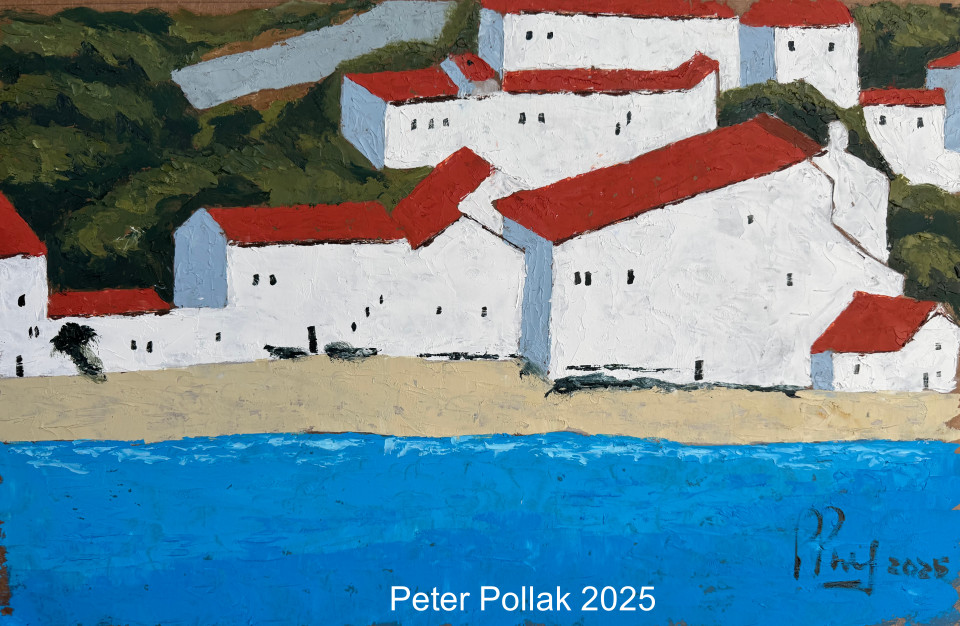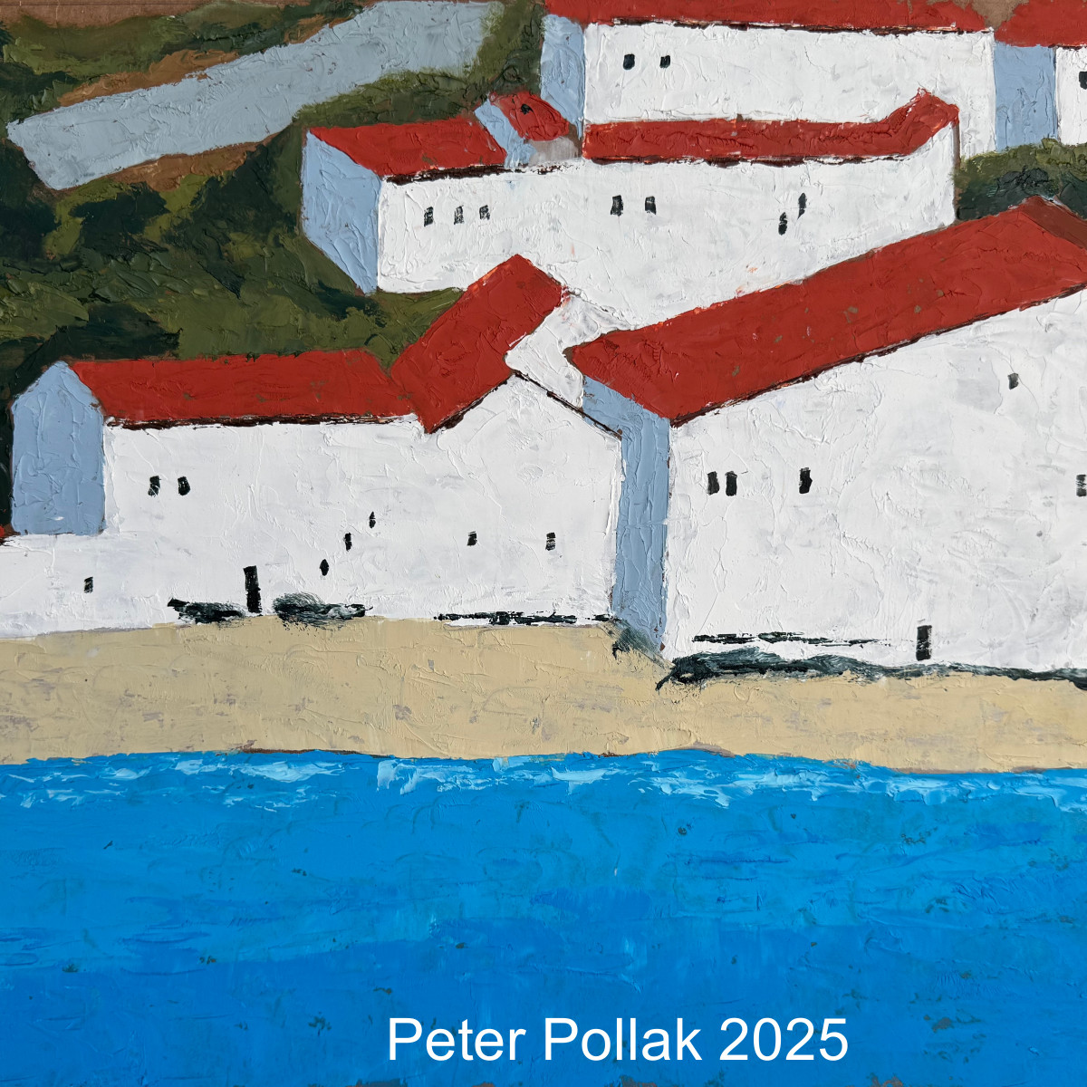 | “Casas Blancas frente a mar 2025” Esta pintura al óleo realizada por Pollak con técnica de espátula, presenta un paisaje costero de fuerte carácter mediterráneo, donde la arquitectura y la naturaleza conviven en un equilibrio sereno y luminoso. En primer plano, el mar de un azul profundo y uniforme actúa como base visual, aportando calma y estabilidad a la composición. Sobre la franja costera se dispone un conjunto de casas blancas de volúmenes simples, alineadas y escalonadas suavemente, cuyos muros claros contrastan con los techos rojizos y con la intensidad cromática del entorno. Las edificaciones, tratadas de manera sintética y geométrica, evocan un poblado costero atemporal, más sugerido que descrito, reforzando una lectura poética del lugar. El fondo se estructura en planos sucesivos de colinas y montañas, trabajadas con empastes densos y trazos amplios de espátula, donde predominan tonos ocres, verdes y tierras. El cielo, amplio y vibrante, se despliega en azules degradados que aportan profundidad y atmósfera, reforzando la sensación de espacio abierto y luz intensa. La espátula deja huellas visibles en toda la superficie, otorgando textura, movimiento y materialidad a la obra. Este tratamiento gestual no solo define formas, sino que también transmite la energía del paisaje y la presencia del artista en el proceso. En conjunto, la pintura comunica una sensación de quietud, armonía y contemplación, donde el blanco de las casas frente al azul del mar se convierte en un diálogo cromático esencial, evocando la relación ancestral entre el habitar humano y el paisaje costero. |