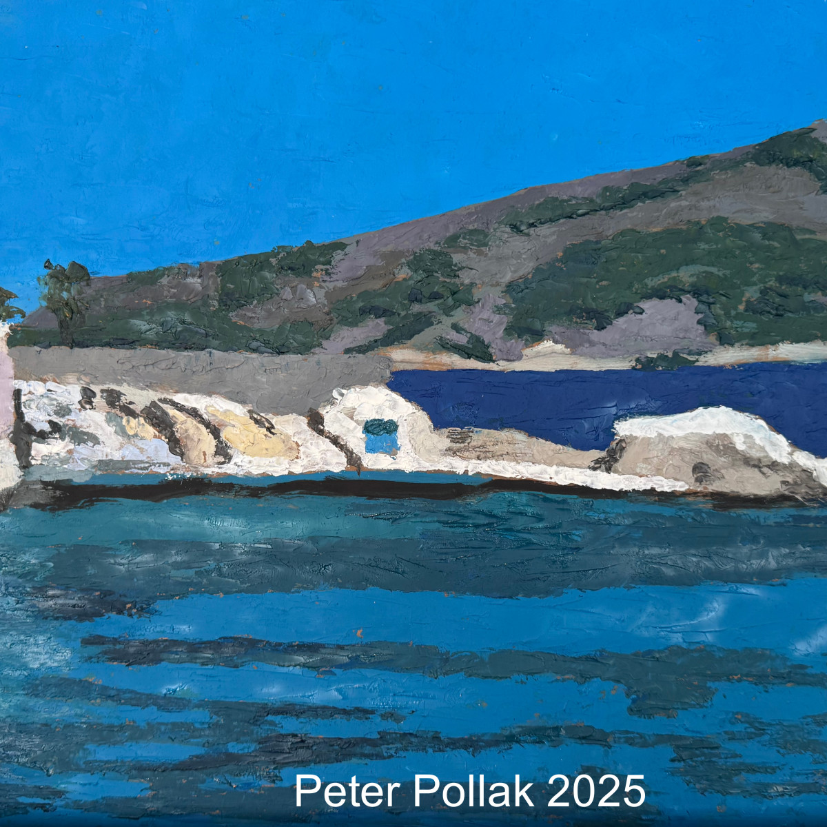 | “Castillo en el mar” es una pintura al óleo de Pollak realizada con técnica de espátula que destaca por su fuerte carácter constructivo y la intensidad del color. La obra presenta una escena costera donde una edificación pétrea, semejante a un castillo o fortaleza, se asienta firmemente sobre rocas blancas, emergiendo entre el mar y la montaña. El primer plano está dominado por el agua, trabajada en amplias pasadas horizontales de azules profundos y turquesas, que transmiten calma y profundidad. La textura espesa de la pintura sugiere el movimiento lento del mar y refleja la luz del cielo, generando una superficie vibrante y dinámica. En el plano medio, las rocas y la construcción se resuelven con tonos claros, grises y ocres, aplicados con espátula en capas gruesas que enfatizan la solidez y el peso de la arquitectura frente al entorno natural. La edificación aparece integrada al paisaje, casi como una prolongación de la roca, reforzando la sensación de permanencia y resistencia. Al fondo, una ladera verde y gris se eleva suavemente bajo un cielo de azul intenso y limpio. El contraste entre el cielo luminoso, el mar profundo y las masas sólidas de tierra y piedra aporta equilibrio a la composición y potencia la lectura espacial. En conjunto, Castillo en el mar es una obra de atmósfera serena y contemplativa, donde la materia pictórica y el gesto de la espátula construyen un diálogo entre arquitectura y naturaleza, evocando aislamiento, fortaleza y silencio frente a la inmensidad del paisaje marino. |