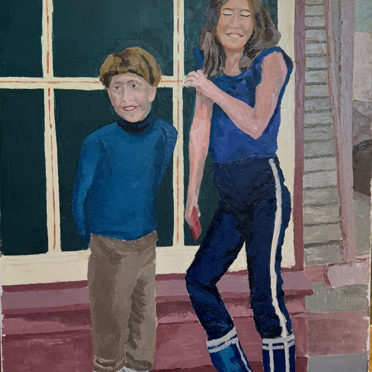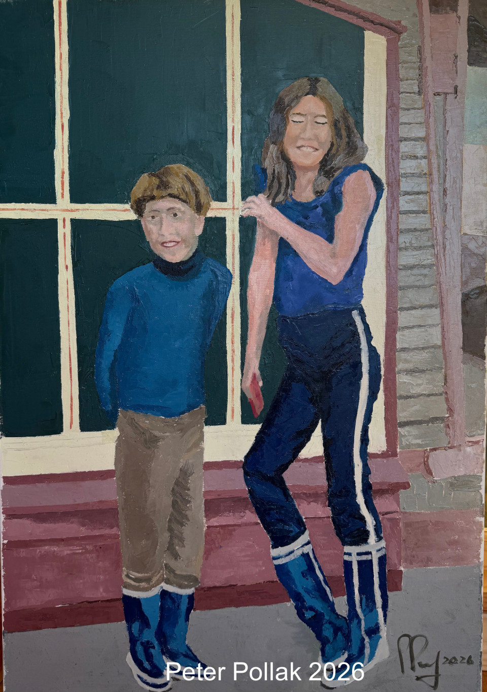 | “Cata y Peter en Temuco” La obra de Pollak representa una escena íntima y cotidiana: una mujer joven y un niño posan frente a una ventana de marcos blancos, apoyados en el umbral exterior de una casa. El entorno sugiere una arquitectura tradicional del sur de Chile, con zócalo rojizo y muro lateral de ladrillo, evocando un contexto urbano residencial propio de Temuco. La composición es vertical y está organizada en torno a la ventana, cuyos travesaños blancos generan una estructura geométrica clara que divide el fondo en cuatro planos verde oscuro. Esta retícula otorga estabilidad visual y enmarca a las figuras, que se sitúan levemente desplazadas hacia la derecha. El niño, a la izquierda, aparece erguido y contenido, con las manos detrás de la espalda. Su postura transmite cierta timidez o serenidad. La mujer, en cambio, adopta una actitud más dinámica: su cuerpo se inclina suavemente, una pierna adelantada, el brazo derecho apoyado en el marco de la puerta o muro. Este contraste gestual crea diálogo entre ambas figuras: quietud y movimiento, infancia y adultez. El modelado de los rostros está resuelto con espátula en planos amplios, evitando el detalle minucioso y privilegiando la síntesis expresiva. El niño muestra una leve sonrisa y una mirada dirigida hacia la izquierda del espectador, como si algo externo captara su atención. La mujer aparece con los ojos cerrados y una sonrisa amplia, transmitiendo espontaneidad y alegría. La construcción anatómica no busca realismo académico sino carácter y presencia emocional. Las transiciones de luz y sombra se logran mediante superposición de capas densas, visibles en mejillas, cabello y brazos. La paleta está dominada por azules profundos y verdes oscuros, equilibrados por los tonos cálidos del zócalo rojizo y los matices rosados de la piel. Ambos personajes comparten un elemento distintivo: botas de agua azul intenso, que se convierten en un punto focal cromático. Estas botas, trabajadas con capas espesas y reflejos blancos, aportan brillo y materialidad. El niño viste pantalón beige y sweater azul. La mujer lleva blusa azul sin mangas y pantalón oscuro con franja blanca lateral, detalle que estiliza la figura y refuerza la verticalidad. El contraste entre los azules fríos de la vestimenta y el verde profundo del fondo intensifica la presencia de las figuras en primer plano. La aplicación con espátula es evidente en toda la superficie. Se perciben capas gruesas, especialmente en ropa y fondo, donde la textura crea vibración lumínica. Los planos no están completamente fundidos; conservan bordes visibles que dan energía a la composición. El fondo verde oscuro está trabajado en capas relativamente uniformes, lo que permite que las figuras destaquen con mayor claridad. En cambio, el muro lateral y el zócalo muestran variaciones tonales que enriquecen la sensación espacial. La escena transmite cercanía y complicidad. La sonrisa relajada de la mujer y la actitud más reservada del niño sugieren un vínculo afectivo —posiblemente familiar— capturado en un momento cotidiano, quizás después de la lluvia, dado el uso de botas. Hay una atmósfera de naturalidad y recuerdo: la obra parece más una evocación emocional que una simple representación. La espátula, con su materia visible y directa, refuerza esa idea de memoria construida a partir de impresiones y sensaciones más que de detalles fotográficos. “Cata y Peter en Temuco” es un retrato doble donde lo arquitectónico estructura la escena, pero lo humano la define. La pintura logra equilibrio entre solidez compositiva y frescura expresiva, destacando el vínculo y la identidad compartida dentro de un entorno cotidiano del sur chileno |