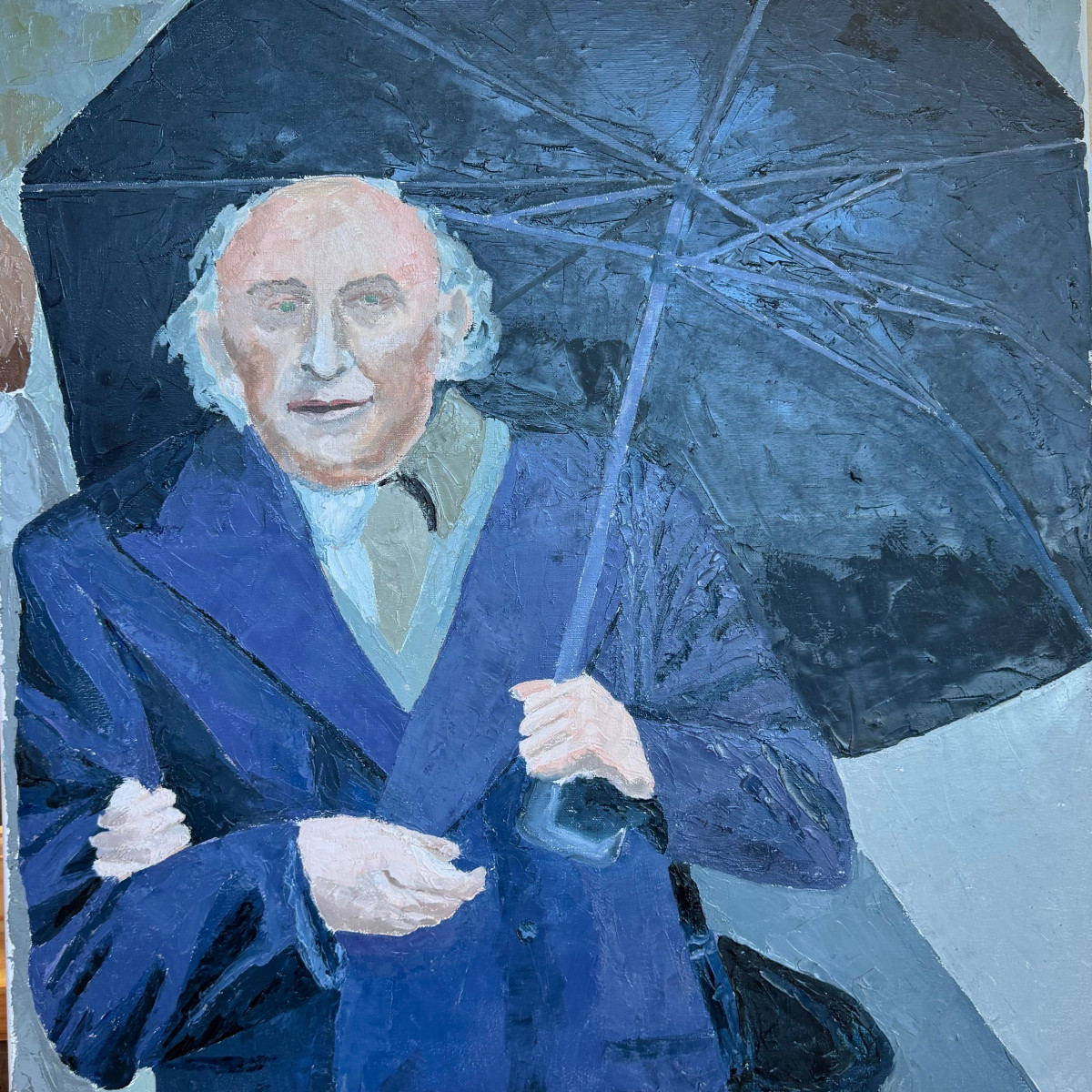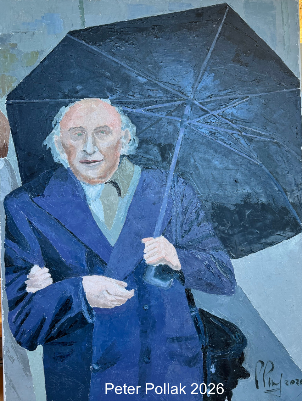 | “Imre Hofbauer, artista en Londres UK” La obra de Pollak presenta un retrato de medio cuerpo de Imre Hofbauer, representado bajo un paraguas abierto que domina gran parte de la composición. La figura se sitúa frontalmente, ocupando el eje central del cuadro, estableciendo una relación directa y silenciosa con el espectador. El encuadre cerrado intensifica la presencia psicológica del personaje y elimina distracciones narrativas externas. El paraguas negro, estructurado mediante líneas radiales claramente marcadas con espátula, genera una geometría envolvente que contrasta con la suavidad del rostro. Sus varillas convergen hacia un punto central ligeramente desplazado, creando tensión compositiva y aportando dinamismo interno a una escena aparentemente estática. La superficie del paraguas está trabajada con capas densas y gestuales, donde la materia pictórica deja huellas visibles que acentúan su textura y peso visual. El rostro del artista es el foco emocional de la pintura. La espátula modela los planos faciales mediante superposiciones de tonos rosados, ocres claros y grises fríos, evitando el detalle minucioso y privilegiando una construcción volumétrica sintética. La frente amplia, el cabello blanco en los laterales y la mirada serena transmiten experiencia, introspección y dignidad. No hay dramatismo exagerado; la expresión es contenida, reflexiva, casi melancólica. La vestimenta —un abrigo azul profundo con matices violáceos— está resuelta con amplios planos de color aplicados con espátula, donde las variaciones tonales construyen volumen sin recurrir a un modelado académico tradicional. Las manos, también tratadas con materia visible, sostienen el paraguas y se recogen sobre el torso en un gesto que sugiere resguardo y recogimiento interior. La paleta cromática está dominada por azules, grises y negros, reforzando la atmósfera londinense lluviosa que el paraguas evoca simbólicamente. El fondo neutro, trabajado en planos verticales suaves y desaturados, permite que la figura se destaque sin competir visualmente. Desde el punto de vista técnico, la espátula cumple un papel esencial: no solo define las texturas —especialmente en el paraguas y el abrigo— sino que aporta una materialidad casi escultórica. La pintura adquiere relieve, y la superficie vibra con pequeñas irregularidades que capturan la luz de manera cambiante. En conjunto, el cuadro no solo retrata a un artista, sino que sugiere una biografía implícita: el exilio, la resiliencia y la vida creativa en una ciudad lluviosa. Es un retrato sobrio, íntimo y respetuoso, donde la técnica matérica refuerza el carácter humano del personaje y convierte la lluvia en metáfora de memoria y permanencia. |