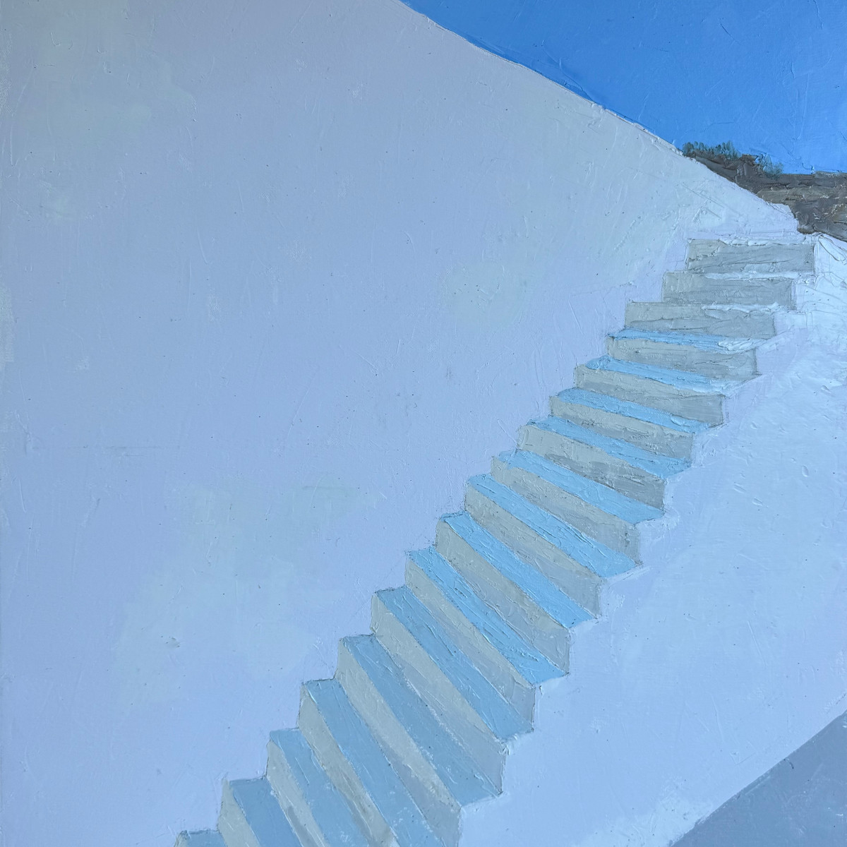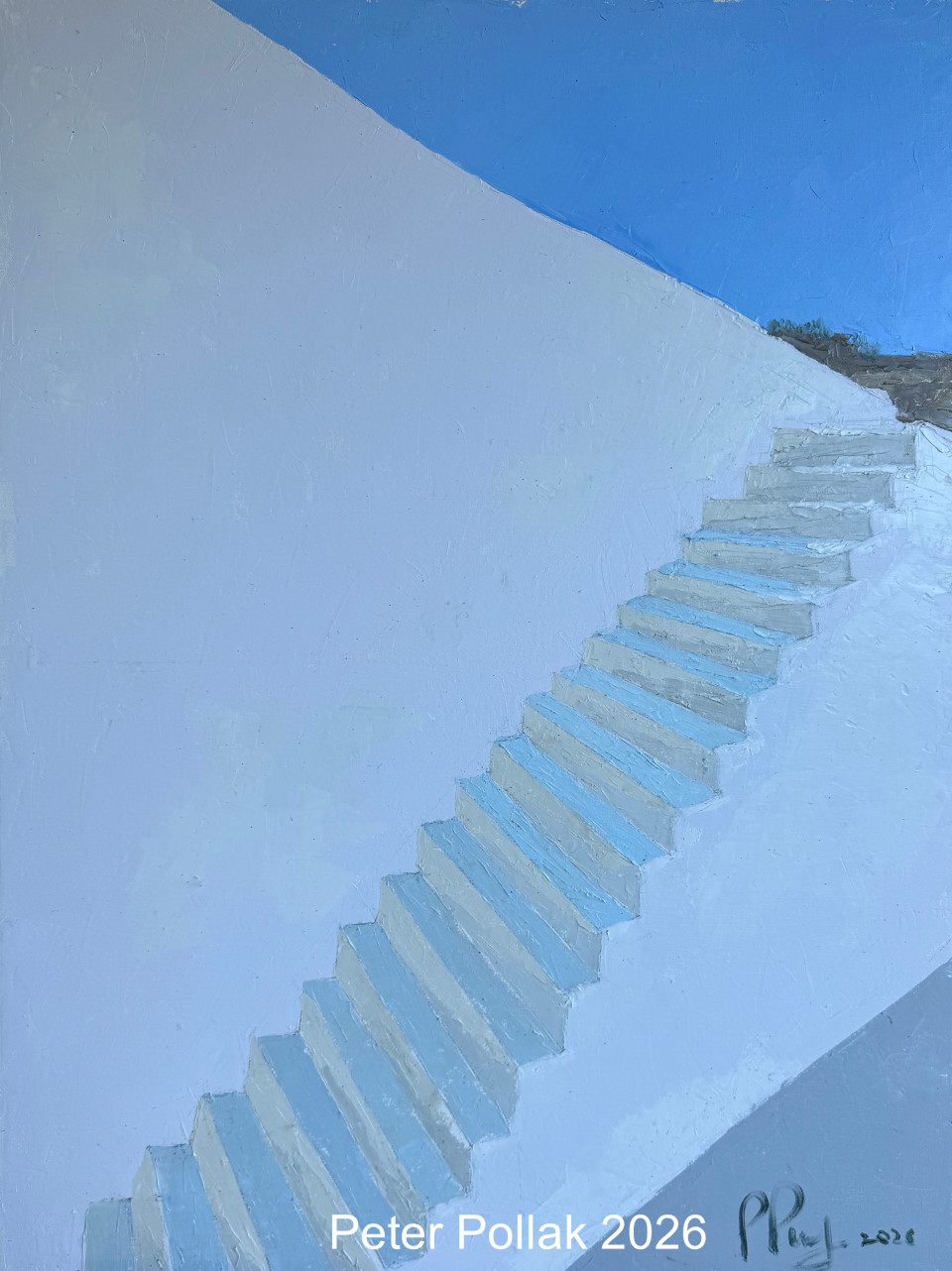 | “La Escala” Esta obra de Pollak se construye desde la síntesis y la depuración formal. El motivo es simple: una escalera blanca que asciende en diagonal hacia la parte superior derecha, donde se encuentra con un borde de tierra y vegetación bajo un cielo intensamente azul. Sin embargo, dentro de esta economía de elementos, la pintura alcanza una fuerte potencia simbólica y espacial. La composición está dominada por una gran diagonal ascendente que organiza todo el cuadro. La escalera nace en el ángulo inferior izquierdo y se proyecta hacia la esquina superior derecha, generando una sensación clara de movimiento y dirección. Un plano blanco inclinado ocupa casi toda la superficie izquierda, funcionando como muro o talud. Este plano contrasta con el cielo azul superior, cuya curva suave establece una tensión geométrica entre recta y arco. La escena está deliberadamente despojada: no hay figuras humanas ni elementos narrativos. La arquitectura y el espacio son los protagonistas. La perspectiva está cuidadosamente construida. Cada peldaño está definido mediante planos de luz y sombra que sugieren volumen sin recurrir al detalle minucioso. Las aristas están levemente suavizadas por la materia de la espátula, lo que aporta organicidad a la geometría. La escalera crea profundidad a través de la repetición rítmica de los peldaños. Este ritmo visual conduce la mirada hacia el horizonte superior, donde aparece una franja de tierra y vegetación que introduce un punto de llegada. La paleta es restringida y armónica: Blancos y azules muy claros en la escalera y el muro. Azul intenso y limpio en el cielo. Un toque terroso y verde en la parte superior, apenas sugerido. El predominio del blanco genera una atmósfera luminosa, casi mediterránea. La luz parece plena, directa, sin dramatismo. Las sombras suaves en azul claro evitan el contraste fuerte y mantienen la serenidad general. El azul del cielo es vibrante pero uniforme, aportando estabilidad y profundidad. La espátula es claramente visible en la textura del muro y de los peldaños. Se perciben arrastres horizontales y verticales que enriquecen la superficie sin recargarla. La materia no es excesiva, pero sí suficiente para que la pintura conserve cuerpo. Las imperfecciones sutiles en los planos blancos aportan humanidad y evitan una frialdad excesiva. La técnica equilibra precisión arquitectónica con gesto manual. La escalera es un símbolo universal de ascenso, tránsito y transformación. Aquí no se muestra el destino final, solo el recorrido. La ausencia de figura humana refuerza el carácter introspectivo: la subida es implícita, abierta a quien contempla. El contraste entre el amplio muro blanco y el cielo azul puede interpretarse como tensión entre límite y libertad. La llegada a la franja superior sugiere esperanza, meta o trascendencia. “La Escala” es una obra de silencio y claridad. Minimalista en su planteamiento, logra profundidad conceptual mediante la pureza de formas y el dominio del espacio. La espátula no busca dramatismo sino estructura y luz. En conjunto, la pintura transmite calma, elevación y una invitación a avanzar, paso a paso, hacia un horizonte luminoso. |