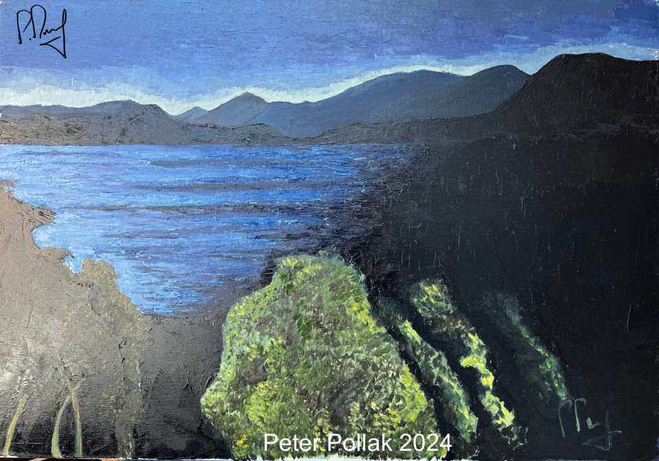 "Lago en noche oscura" es una obra cautivadora que evoca la serenidad y el misterio de un paisaje nocturno. La pintura presenta un lago tranquilo bajo un cielo estrellado, capturando la atmósfera mágica y contemplativa de la noche.La técnica de espátula utilizada en esta obra da lugar a una textura rica y envolvente, que acentúa la profundidad del agua y el brillo de las estrellas. La paleta de colores es predominantemente oscura, con tonos de azules profundos y negros, salpicados de destellos de blanco y plateado que representan la luz de la luna y las estrellas reflejadas en la superficie del lago.El agua, calmada y serena, actúa como un espejo que refleja la belleza del entorno, creando una sensación de paz y quietud. La composición puede incluir siluetas de árboles o montañas en el horizonte, que añaden un sentido de profundidad y contexto al paisaje nocturno.El fondo de la obra, con su cielo estrellado, invita a la reflexión y la contemplación, evocando sentimientos de soledad y conexión con la naturaleza. "Lago en noche oscura" no solo es una representación visual de un momento en la noche, sino que también invita al espectador a experimentar la tranquilidad y el asombro que se encuentran en la oscuridad, recordando la belleza que a menudo se revela en los momentos más silenciosos.