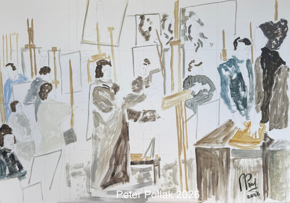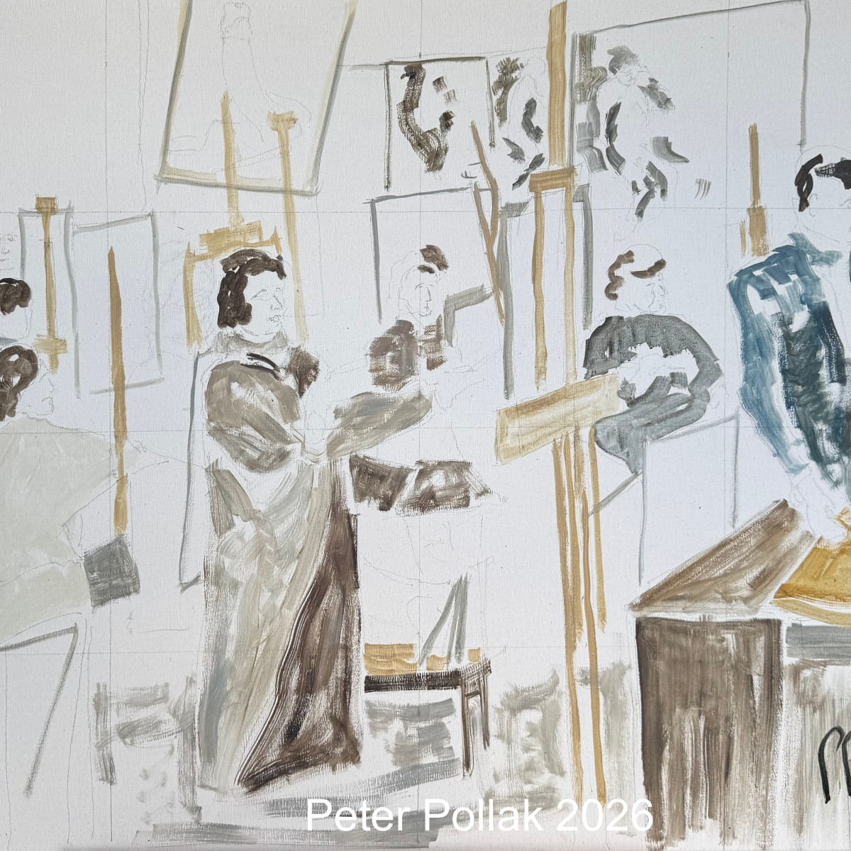 | “Mi taller de pintura en escuela de arte, Londres – Bosquejo a color” Óleo (bosquejo cromático) · 2026 La obra de Pollak representa una escena interior de taller académico, captando la atmósfera de estudio y concentración propia de una escuela de arte. Se trata de un bosquejo a color donde la síntesis formal y la economía de medios son protagonistas, privilegiando la estructura compositiva y la memoria visual por sobre el detalle acabado. La escena se organiza en un espacio amplio, poblado por caballetes verticales que estructuran el plano pictórico como una sucesión de líneas doradas y ocres. Estas verticales generan ritmo y profundidad, dividiendo el espacio en compartimentos donde se sitúan los estudiantes y sus trabajos. En el centro se destaca una figura femenina de pie, vestida con un delantal claro. Su postura activa —con el brazo elevado hacia el lienzo— sugiere el acto mismo de pintar o corregir. Ella funciona como eje compositivo y narrativo: es el punto de convergencia de miradas y de energía visual. A la izquierda se agrupan varios estudiantes sentados o de perfil, apenas sugeridos con manchas suaves. Sus rostros y cuerpos no están detallados; son presencias captadas en gestos mínimos, reforzando el carácter evocativo del recuerdo. En el lado derecho aparece un modelo masculino sobre un pedestal. Su figura está tratada con mayor contraste tonal, especialmente en la zona del torso y la cabeza, donde las masas oscuras definen volumen y peso. Junto a él, otro personaje vestido con tonos azul verdosos aporta un contrapunto cromático más intenso dentro de la paleta general sobria. El lenguaje es suelto y sintético. Predominan los tonos tierra —ocres, sepias, grises cálidos— con intervenciones puntuales en azul y negro. El color no busca naturalismo, sino establecer jerarquías espaciales y rítmicas. El dibujo subyacente es visible en varias zonas, especialmente en las figuras apenas esbozadas. Las pinceladas son amplias, a veces casi gestuales, dejando áreas del soporte prácticamente sin cubrir. Esta transparencia refuerza la idea de estudio preliminar o memoria reconstruida. Las líneas verticales de los caballetes, aplicadas con tonos dorados, actúan como columnas que sostienen la composición y ordenan el espacio. El suelo y los planos de apoyo están apenas insinuados con manchas grises y marrones que sugieren volumen sin describirlo. La iluminación es difusa y homogénea, propia de un taller con luz natural filtrada. No hay sombras dramáticas; la atmósfera es tranquila, reflexiva, casi silenciosa. El blanco predominante del fondo contribuye a esa sensación de amplitud y claridad. Más que un registro literal, la obra transmite la experiencia emocional del taller: el aprendizaje, la observación del modelo, el intercambio silencioso entre profesor y alumnos. El bosquejo a color funciona como evocación de un período formativo, donde el espacio académico se convierte en escenario de descubrimiento artístico. La pintura posee un carácter íntimo y autobiográfico. La simplificación formal, lejos de restar fuerza, concentra la atención en la estructura y en la vivencia interior del artista. Es una memoria visual condensada, donde lo esencial permanece y lo accesorio desaparece. |