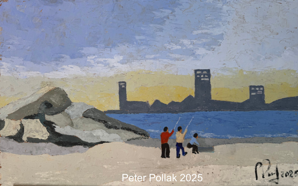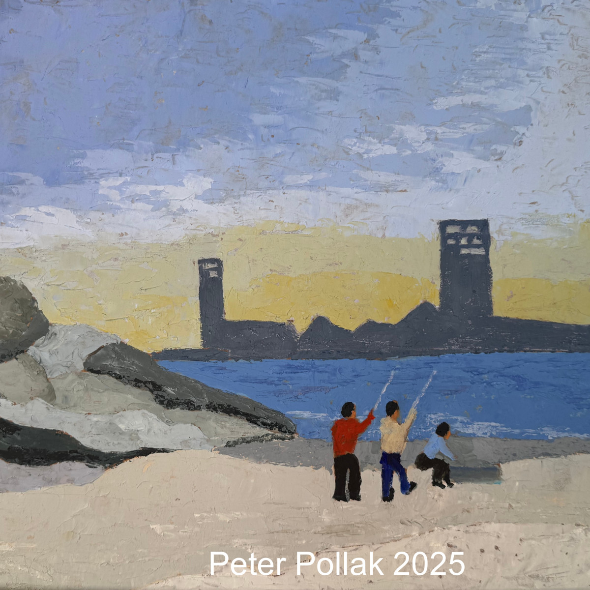 | “Pescadores en la playa 2025” es una pintura al óleo de Pollaak trabajada con espátula que transmite una escena cotidiana cargada de serenidad y memoria. En primer plano, tres figuras humanas —dos adultos y un niño— aparecen de espaldas, concentradas en la acción simple y ancestral de la pesca desde la orilla. Sus gestos mínimos y la ausencia de detalles faciales refuerzan el carácter universal de la escena, donde importa más el acto compartido que la identidad individual. La composición se estructura en franjas horizontales bien definidas: la arena clara y texturada del primer plano, el mar profundo en tonos azules y, al fondo, la silueta oscura de una ciudad costera que se recorta contra un cielo luminoso. Este contraste entre lo natural y lo urbano introduce una tensión sutil entre dos mundos que coexisten: la vida simple y el paisaje construido. El uso de la espátula es evidente en las superficies rugosas y en los empastes que construyen rocas, arena y cielo, aportando materialidad y ritmo al conjunto. La paleta cromática es contenida pero expresiva: azules, ocres y grises dominan el paisaje, mientras los colores más vivos de la vestimenta de los pescadores —rojos y azules— actúan como puntos focales que animan la escena. En conjunto, la obra evoca calma, contemplación y una cierta nostalgia, capturando un instante detenido en el tiempo donde la relación del ser humano con el mar se presenta como algo íntimo, sencillo y profundamente humano. |
