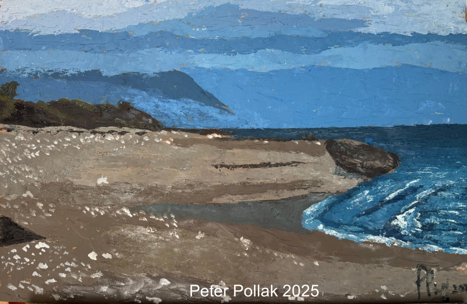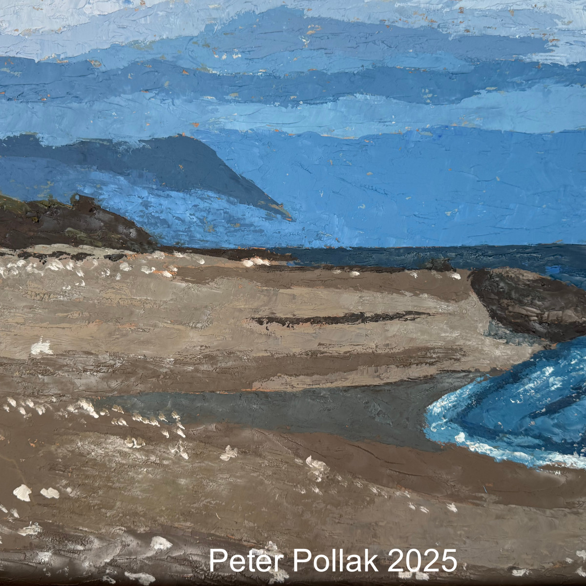 | “Playa al sur de Puerto Montt 2025” es una pintura al óleo poe Pollak realizada con técnica de espátula que captura la fuerza silenciosa y el carácter austero del paisaje costero del sur de Chile. La composición se construye a partir de amplios planos horizontales que organizan el espacio y conducen la mirada desde la tierra hacia el mar y el cielo. En primer plano, la playa aparece modelada con tonos tierra, grises y ocres, aplicados con capas densas y texturadas que sugieren la humedad del suelo y las huellas dejadas por el viento y el agua. Pequeños toques claros, casi blancos, aportan ritmo y luminosidad, evocando reflejos de luz sobre la arena y restos de espuma. El mar se abre hacia la derecha con un azul profundo y frío, trabajado con espátula en gestos curvos y enérgicos que transmiten movimiento y la persistente acción de las olas. Este dinamismo contrasta con la solidez de la playa y con las formas más contenidas del fondo. Al fondo, las colinas y promontorios se superponen en una gama de azules y verdes apagados, creando una sensación de profundidad y atmósfera húmeda, característica del sur austral. El cielo, amplio y cargado de matices, envuelve la escena con una luz difusa que refuerza el clima contemplativo de la obra. La materia pictórica es protagonista en toda la composición, convirtiendo el paisaje en una experiencia sensorial más que descriptiva. Playa al sur de Puerto Montt transmite quietud, aislamiento y respeto por la naturaleza, invitando a una mirada pausada sobre un territorio donde el mar y la tierra se encuentran en permanente diálogo. |