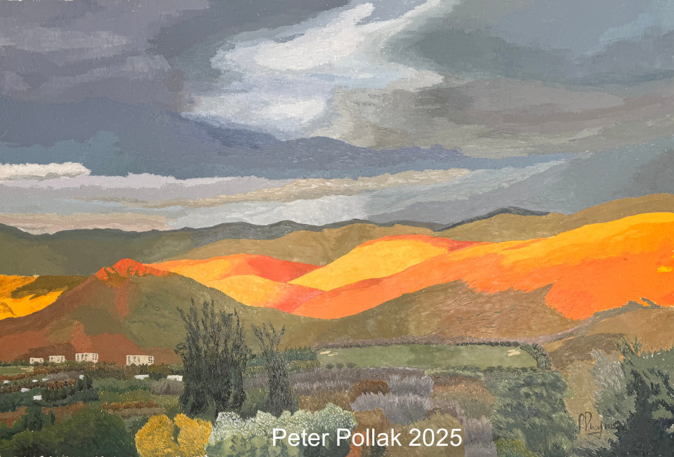 | “ Puesta de sol en Chicureo 2025” En esta obra, Peter Pollak captura la fuerza emocional de una puesta de sol en Chicureo, donde la luz se convierte en protagonista y transforma el paisaje en un escenario dramático y poético. La técnica de espátula, aplicada con maestría, permite construir un relieve pictórico que transmite la energía del instante y otorga volumen a cada plano del terreno. En primer plano, la vegetación aparece con texturas ricas y variadas, representada en tonos verdes, ocres y grisáceos que revelan la diversidad del paisaje chileno. Al fondo, los cerros se iluminan con una intensidad dorada y anaranjada casi incandescente, como si el sol se despidiera incendiando suavemente las laderas. Esta franja de luz cálida contrasta con un cielo de nubes densas y tonos fríos —grises, azules y violetas— creando un equilibrio visual que sugiere calma y tensión a la vez. Las manchas de color, aplicadas mediante espátula, generan un efecto de movimiento y vibración lumínica. Hay una sensación de vastedad, pero también de intimidad: la naturaleza se vuelve símbolo de introspección, observada desde una distancia emocional, casi meditativa. “Puesta de sol en Chicureo” es más que un paisaje real; es un momento suspendido en el tiempo, donde el color se vuelve emoción y la memoria del lugar se convierte en pintura. |