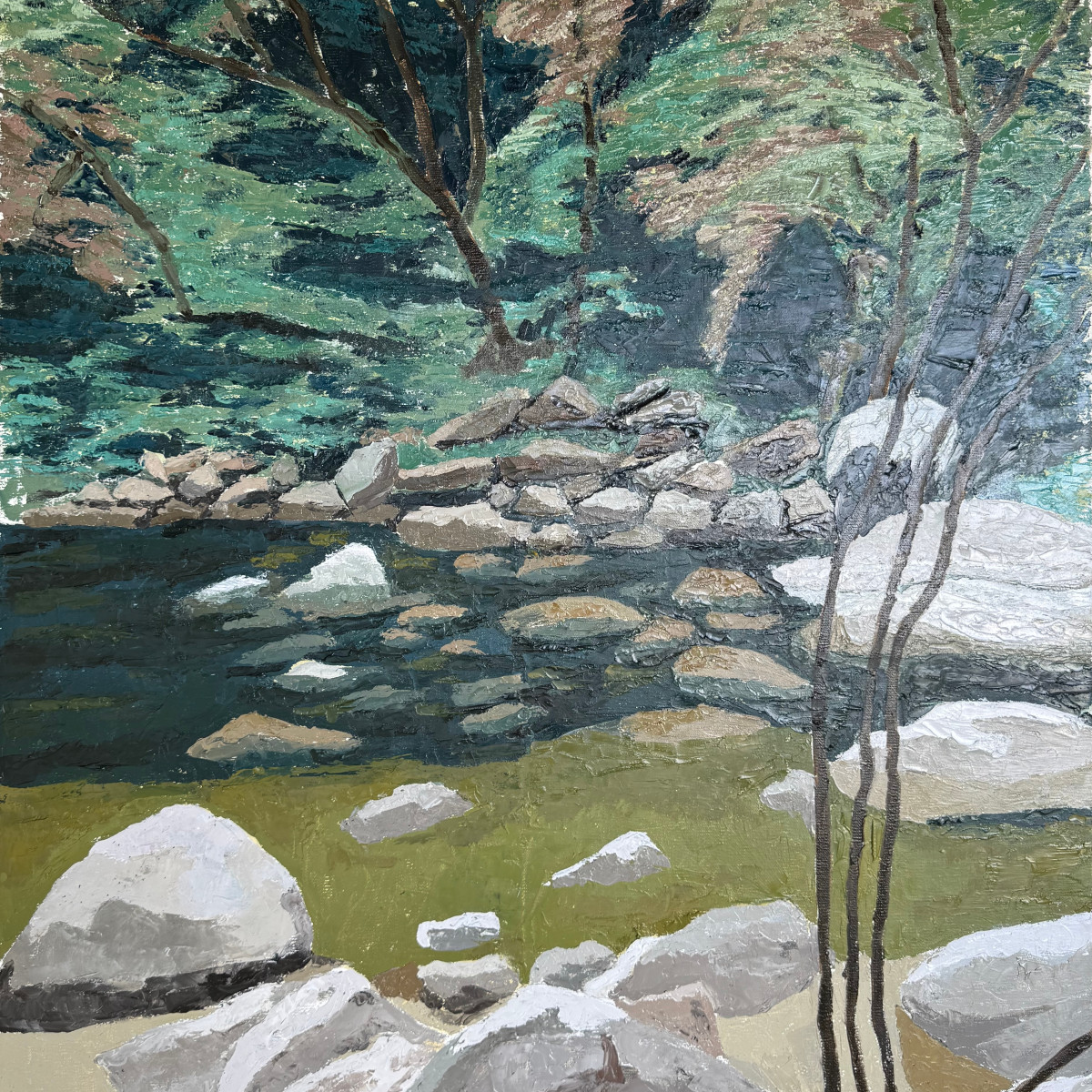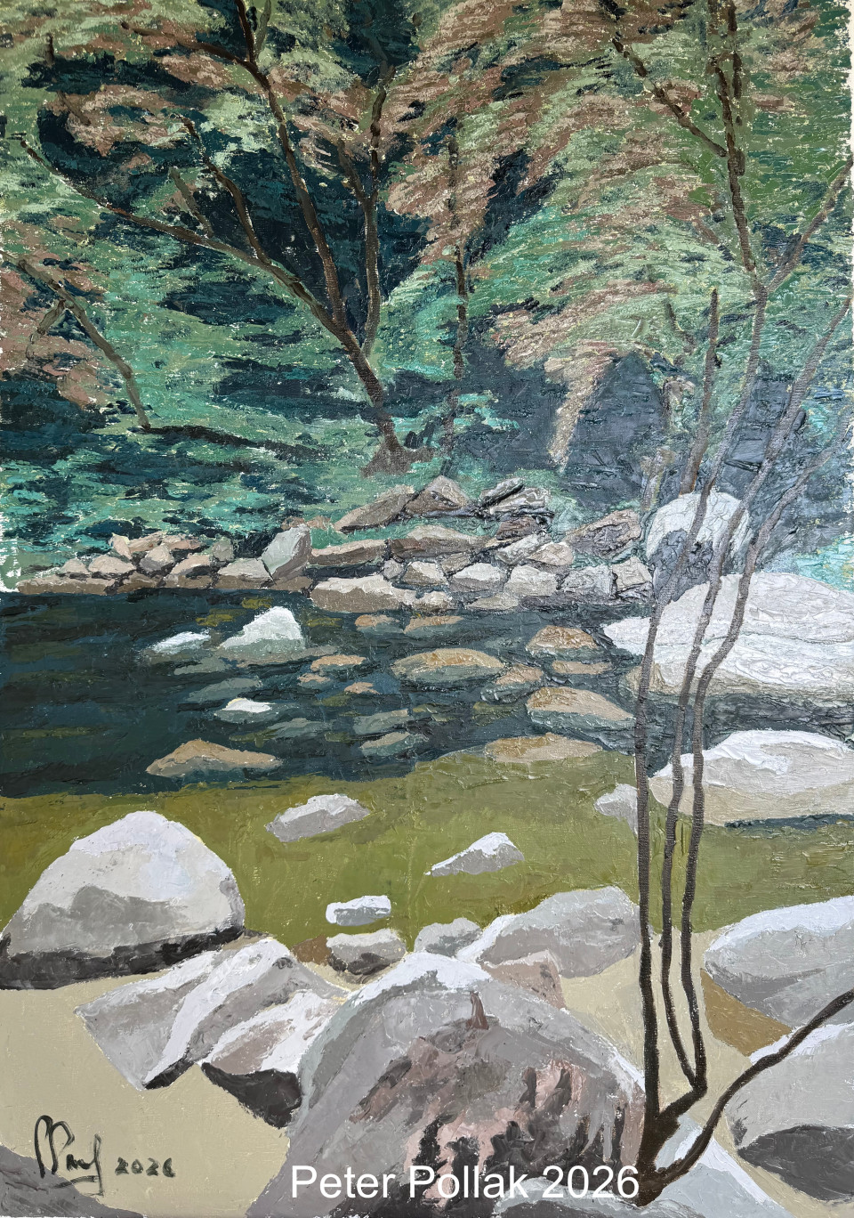 | “Río con rocas” La obra de Pollak presenta un paisaje fluvial de atmósfera serena e introspectiva, donde el protagonista no es solo el río, sino el diálogo entre agua, piedra y vegetación. La composición se estructura en planos superpuestos que conducen la mirada desde el primer plano rocoso hasta el fondo boscoso, generando profundidad sin recurrir a artificios perspectivos evidentes. En primer plano, grandes rocas claras ocupan la base del cuadro. Están construidas con espátula en amplios planos grises, blancos y ocres suaves. La materia es visible, espesa, casi escultórica, otorgando peso y volumen a cada piedra. Las aristas no están delineadas con rigidez, sino sugeridas mediante cambios tonales que capturan la incidencia de la luz. Estas rocas establecen una base sólida y estable, un anclaje visual que contrasta con la fluidez del agua. El río atraviesa horizontalmente la composición en un plano medio. El agua, trabajada con verdes profundos, azules oscuros y reflejos oliváceos, revela transparencias sutiles que permiten entrever piedras sumergidas. La espátula aquí no solo deposita pintura, sino que arrastra y mezcla capas, creando vibraciones que sugieren corriente suave y movimiento contenido. Pequeñas manchas claras insinúan espuma y reflejos luminosos. En la ribera opuesta, una franja de rocas medianas crea una transición hacia el fondo. Más allá, el paisaje se eleva en un bosque denso de verdes variados: esmeraldas, verdes grisáceos y toques terrosos. Las masas arbóreas están resueltas con pinceladas amplias y superpuestas, donde la textura matérica sugiere follaje sin describir hoja por hoja. La luz parece filtrarse desde arriba, generando claros y sombras que aportan profundidad atmosférica. Un elemento vertical destacado son los delgados troncos en el lado derecho del cuadro. Estos trazos oscuros, finos y firmes, introducen ritmo y equilibrio compositivo, contrapesando la horizontalidad dominante del río. Actúan como marco natural y como pausa visual, aportando tensión lineal dentro de la suavidad general del paisaje. La paleta cromática es armónica y contenida, dominada por verdes, grises y tierras. No hay estridencias; la pintura transmite calma, contemplación y recogimiento. La luz no es dramática, sino difusa, como en un día templado donde el bosque amortigua el resplandor. Desde el punto de vista técnico, la espátula es esencial: construye volúmenes sólidos en las rocas, genera texturas densas en el follaje y crea superficies vibrantes en el agua. La materia pictórica es protagonista, dejando huellas visibles que refuerzan la presencia física del paisaje. En conjunto, la obra no busca espectacularidad, sino intimidad. Es un paisaje de observación atenta, donde la naturaleza se presenta en equilibrio silencioso: permanencia en la piedra, tránsito en el agua y vida latente en el bosque. |