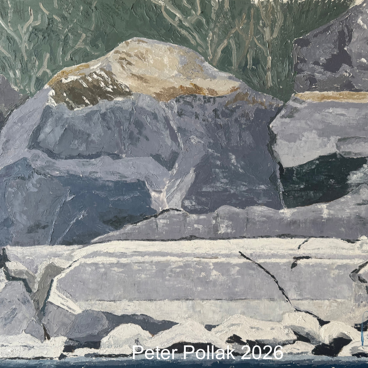 | “Rocas de orilla marcando niveles del lago” La obra de Pollak presenta un primer plano de grandes rocas en la orilla de un lago, trabajadas con una pintura densa y matérica que evidencia el uso decidido de la espátula. Los volúmenes pétreos se superponen en planos horizontales y oblicuos, construyendo una geología casi escultórica donde cada estrato queda claramente definido por cambios sutiles de color y textura. La paleta está dominada por una gama de grises fríos, azules acerados y blancos quebrados, que sugieren la humedad permanente de la roca y el desgaste producido por el agua a lo largo del tiempo. En contraste, leves toques de ocres y verdes apagados aparecen en las zonas superiores, insinuando sedimentos minerales y restos de vegetación que delatan antiguas variaciones del nivel del lago. Las marcas horizontales, casi lineales, que atraviesan las rocas funcionan como un registro natural del paso del tiempo: huellas del ascenso y descenso del agua que han ido “escribiendo” su historia sobre la piedra. En la franja inferior, el blanco más luminoso y quebrado señala el contacto directo con el agua actual, donde la erosión es más reciente y visible. El fondo, tratado con verdes grisáceos y pinceladas verticales más sueltas, sugiere la vegetación ribereña y aporta profundidad sin restar protagonismo al conjunto rocoso. La composición, sobria y equilibrada, transmite una sensación de silencio y permanencia, invitando a contemplar la relación entre naturaleza, tiempo y memoria. La obra se convierte así en una reflexión visual sobre la huella persistente del agua y la lenta transformación del paisaje lacustre. |